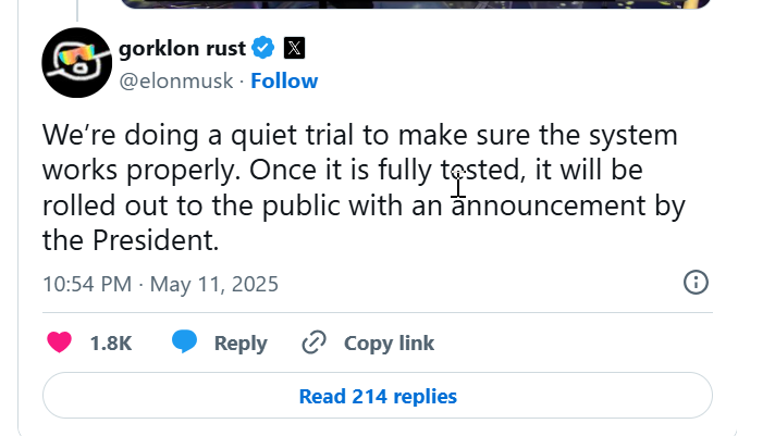 马斯克在X(前身为推特)上发文称:“一旦全面测试完成,总统将宣布向公众推出该计划。”该贴是在回应有影响力的人物、国际区块链咨询公司(IBC Group)首席执行官马里奥・纳瓦尔(Mario Nawfal),纳瓦尔曾分享了关于新签证的细节,包括专门的政府网站以及由政府效率部(DOGE)构建的数字后端。