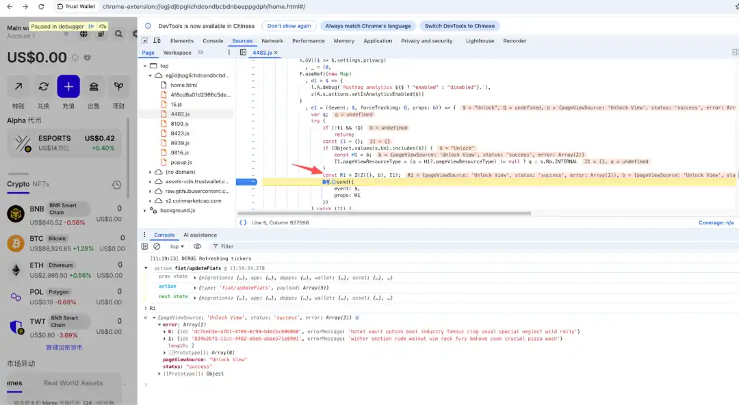 通過動態分析可以看到在解鎖錢包後,可以在 R1 中看到攻擊者將助記詞信息填充到 error 裡面。