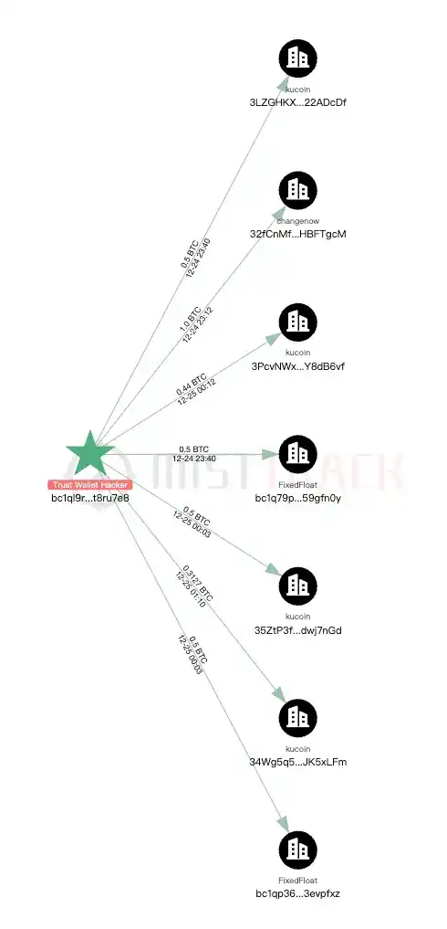 根據 ZachXBT 披露的駭客地址,我們統計發現,截至發文時,Bitcoin 鏈上被竊資產總數約 33 BTC(價值約 300 萬 USD),Solana 鏈上被竊資產價值約 431 USD,Ethereum 主網及 Layer 2 等各條鏈被竊資產價值約 300 萬 USD。駭客在竊幣後把部分資產利用各種中心化交易平臺和跨鏈橋進行資產轉移和兌換。