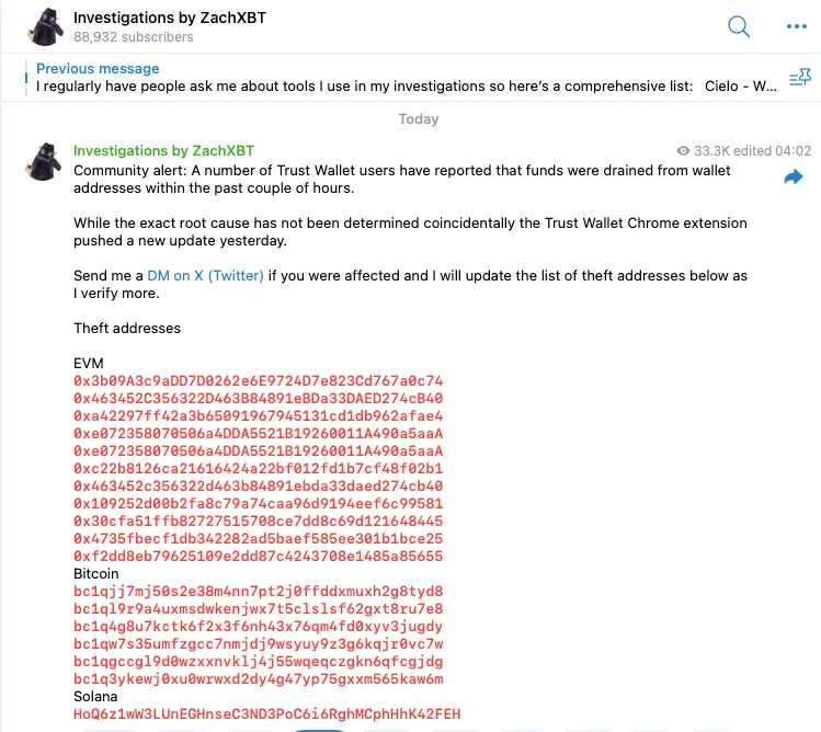 This morning Beijing time, @zachxbt posted a message in the channel stating that "some Trust Wallet users reported that funds in their wallet addresses were stolen in the past few hours." Subsequently, Trust Wallet's official X also released an official message, confirming that Trust Wallet browser extension version 2.68 has a security risk, reminding all users using version 2.68 to immediately disable this version and upgrade to version 2.69.