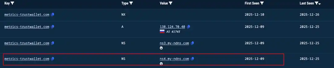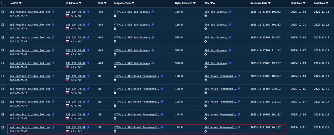 Starting from 2025-12-21, there are initial records of requests targeting api.metrics-trustwallet[.]com.