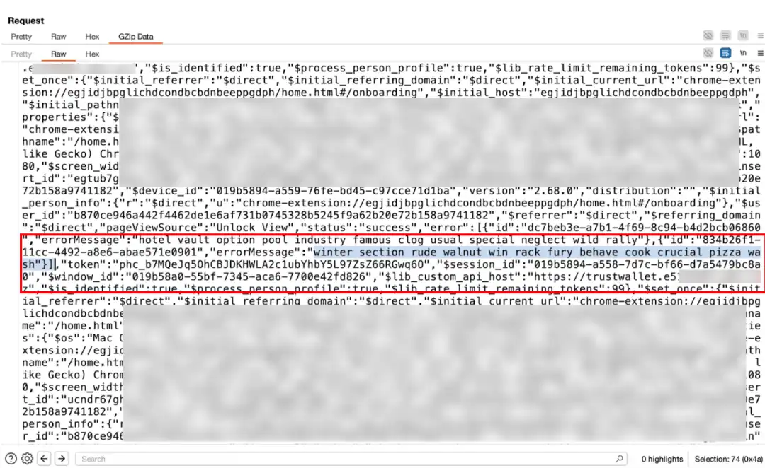 通過 BurpSuite 進行的流量分析顯示,在獲取到助記詞後,將其封裝在請求體的 errorMessage 欄位中,並發送到惡意伺服器 (https[://]api[.]metrics-trustwallet[.]com),這與前面的分析是一致的。