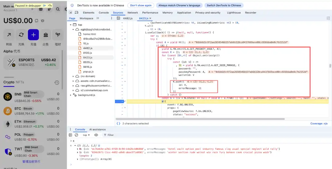 The malicious code traverses all wallets in the plugin and initiates a "get mnemonic" request for each user's wallet to obtain the user's encrypted mnemonic, and finally uses the password or passkeyPassword entered by the user when unlocking the wallet for decryption. If decryption is successful, the user's mnemonic will be sent to the attacker's domain `api.metrics-trustwallet[.]com`.