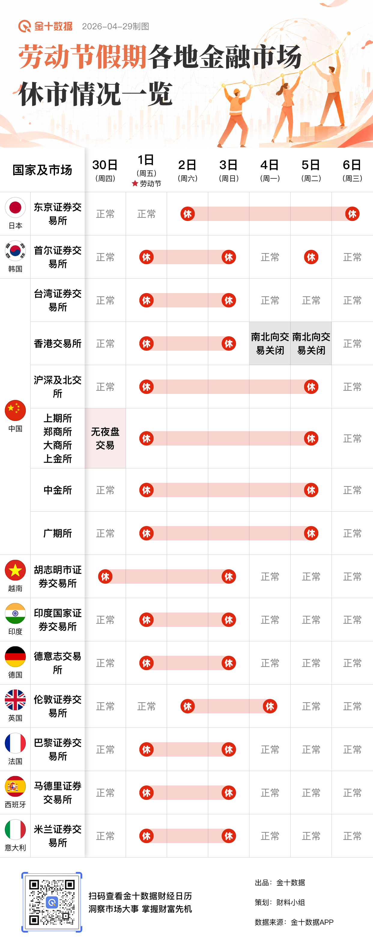 “五一”假期来临,内盘期货今晚无夜盘交易,明起中国、欧洲、韩国多地金融市场进入休市模式。...