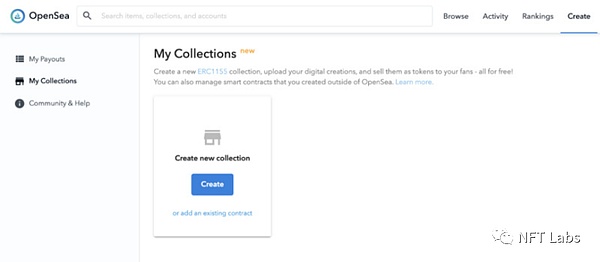 OpenSea 平台也支持 NFT 创建,而且完全免费,用户不需支付手续费来部署智能合约。点击网站右上角的“Create”就可以开始创造了。